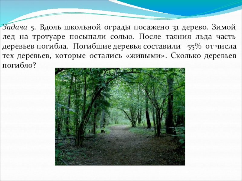 Слайд 17Задача 5. Вдоль школьной ограды посажено 31 дерево. Зимой лед на