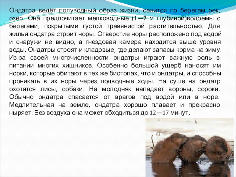 Слайд 13Ондатра ведёт полуводный образ жизни, селится по берегам рек, озёр. Она