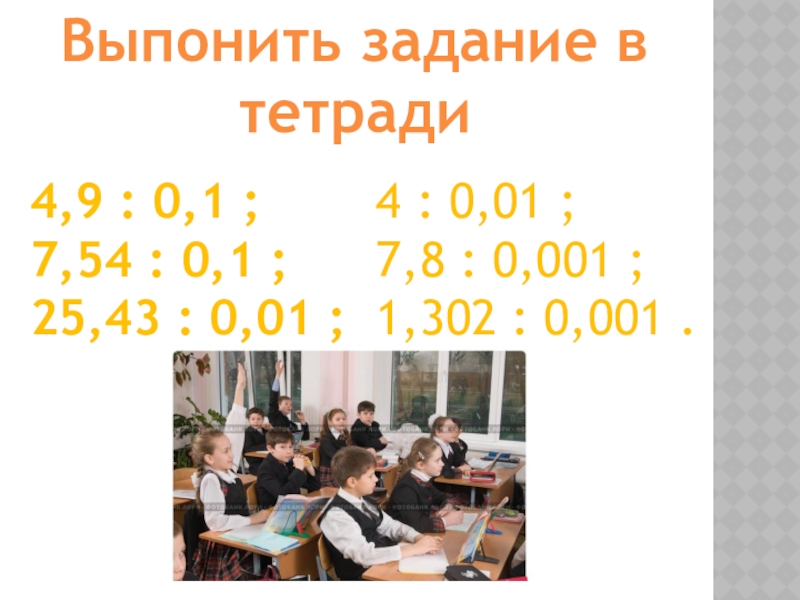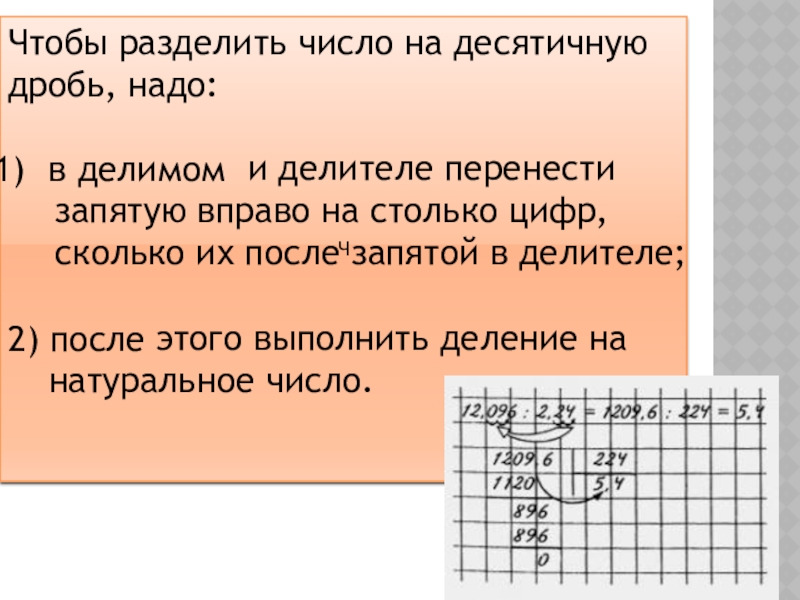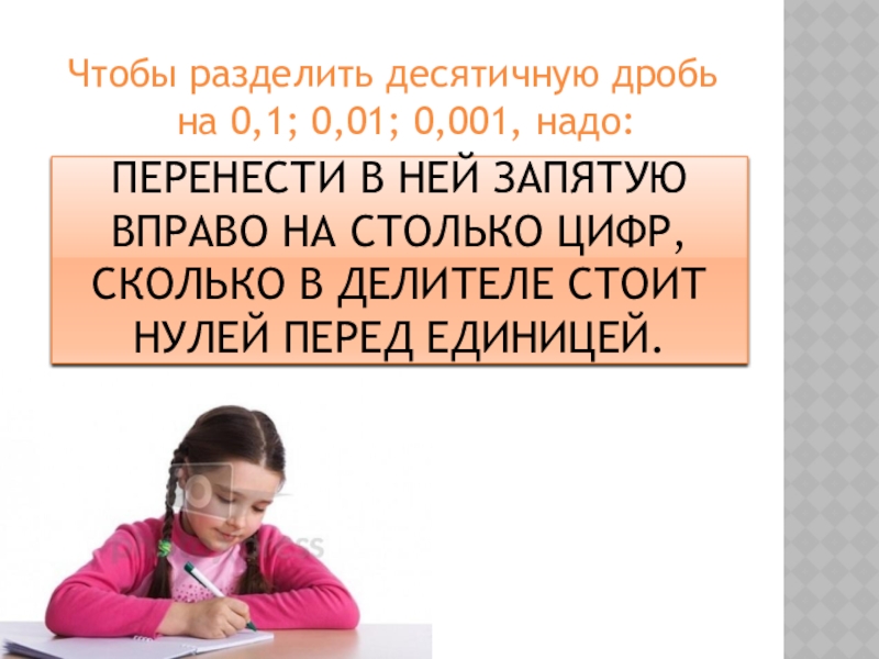 Чтобы разделить десятичную дробь на 0,1; 0,01; 0,001, надо: