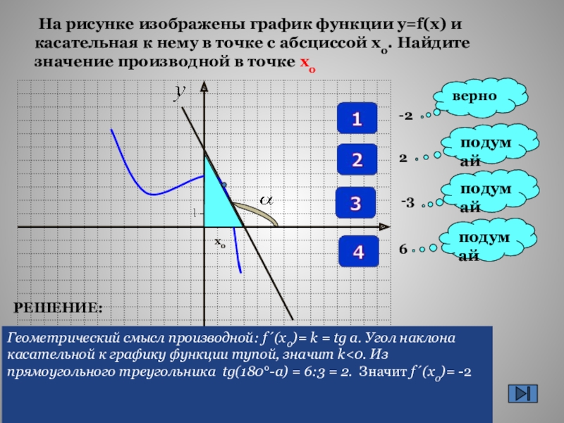 Геометрический смысл производной: f´(x0)= k = tg a. Угол наклона касательной к графику функции тупой, значит k<0. Из прямоугольного треугольника tg(180°-а) = 6:3 = 2. Значит f´(x0)= -2