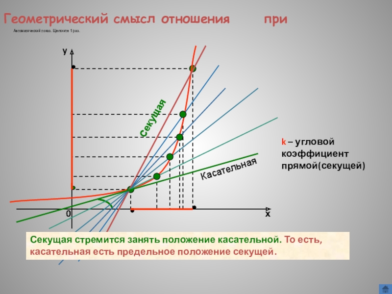 Секущая стремится занять положение касательной. То есть, касательная есть предельное положение секущей.
