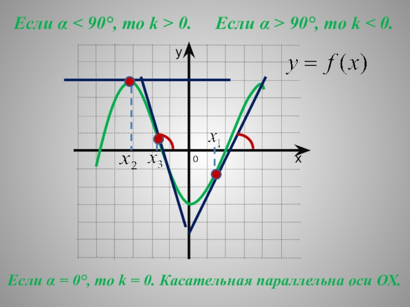 Если α = 0°, то k = 0. Касательная параллельна оси ОХ.