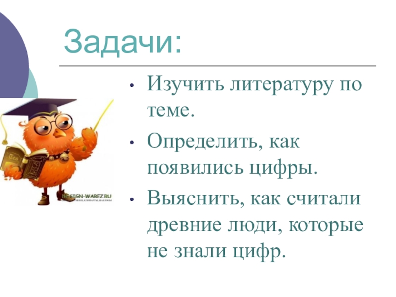 Задачи:Изучить литературу по теме.Определить, как появились цифры.Выяснить, как считали древние люди, которые не знали цифр.