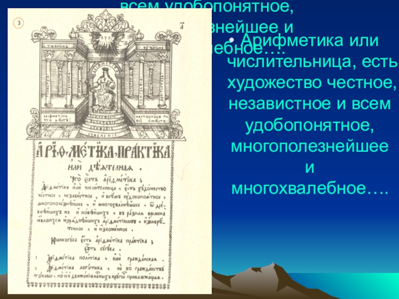 Арифметика или числительница, есть художество честное, независтное и всем удобопонятное, многополезнейшее и многохвалебное….