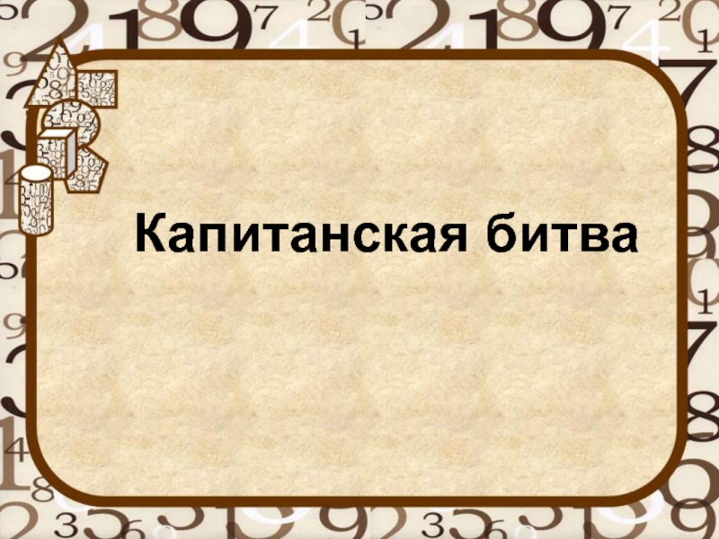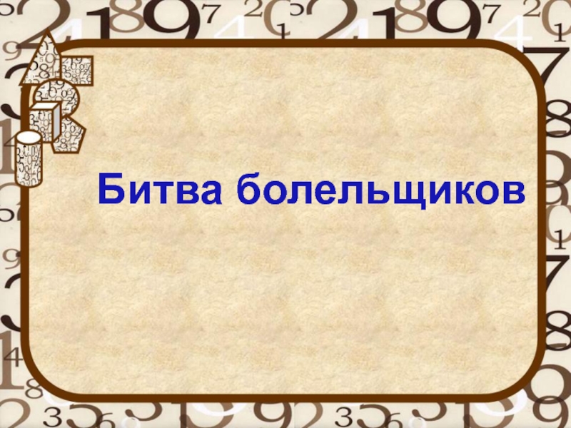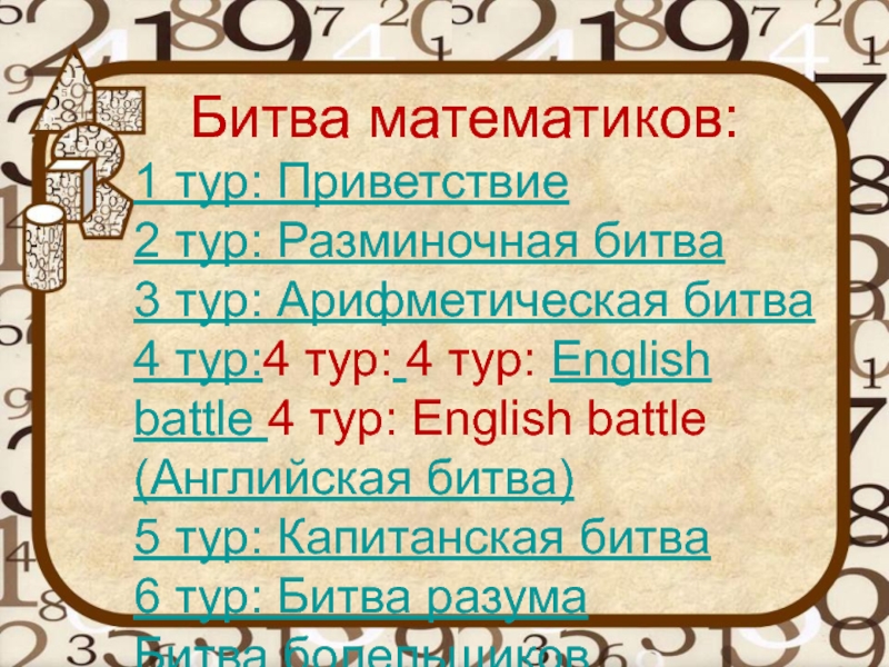 Битва математиков:1 тур: Приветствие2 тур: Разминочная битва3 тур: Арифметическая битва4 тур:4 тур: 4 тур: English battle 4