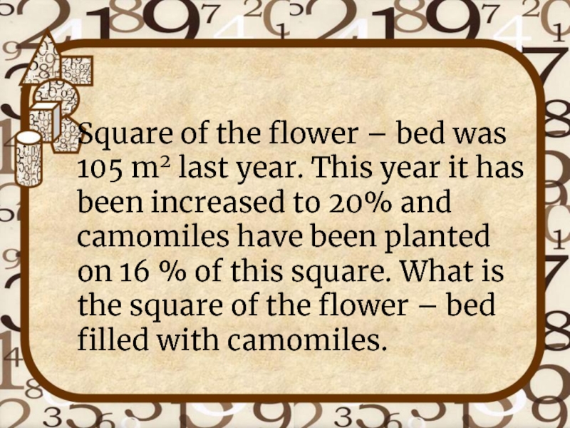 Слайд 6Square of the flower – bed was 105 m2 last year.