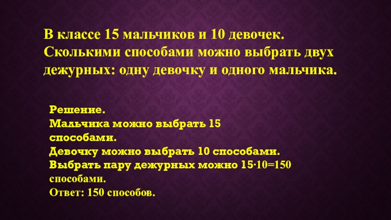 Выбрать пару дежурных можно 15∙10=150 способами.
