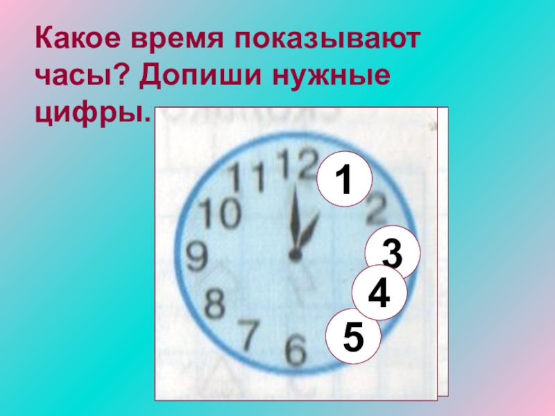 Слайд 32Какое время показывают часы? Допиши нужные цифры.