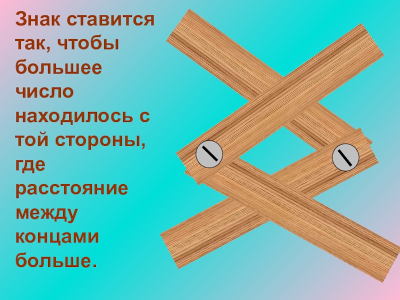 Слайд 14Знак ставится так, чтобы большее число находилось с той стороны, где