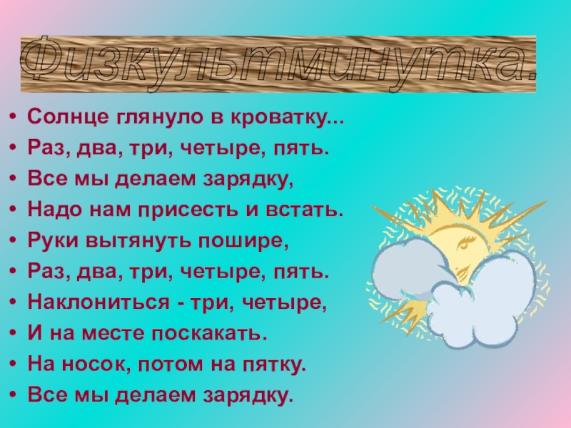 Солнце глянуло в кроватку... Раз, два, три, четыре, пять. Все мы делаем зарядку, Надо нам присесть и