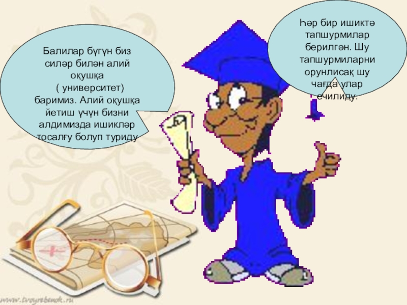 ( университет) баримиз. Алий оқушқа йетиш үчүн бизни алдимизда ишикләр тосалғу болуп туриду