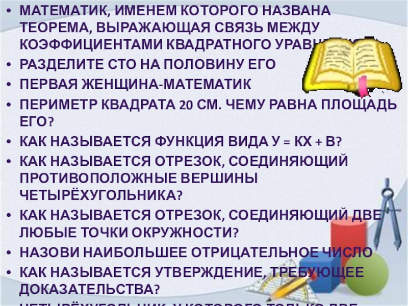 Слайд 6Математик, именем которого названа теорема, выражающая связь между коэффициентами квадратного уравнения?