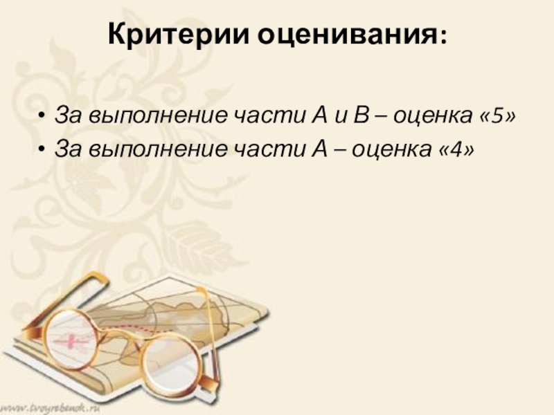 Критерии оценивания: За выполнение части А и В – оценка «5»За выполнение части А – оценка «4»