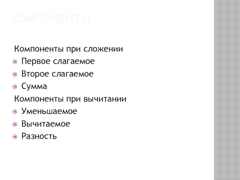 КомпонентыКомпоненты при сложении Первое слагаемоеВторое слагаемоеСуммаКомпоненты при вычитании УменьшаемоеВычитаемоеРазность