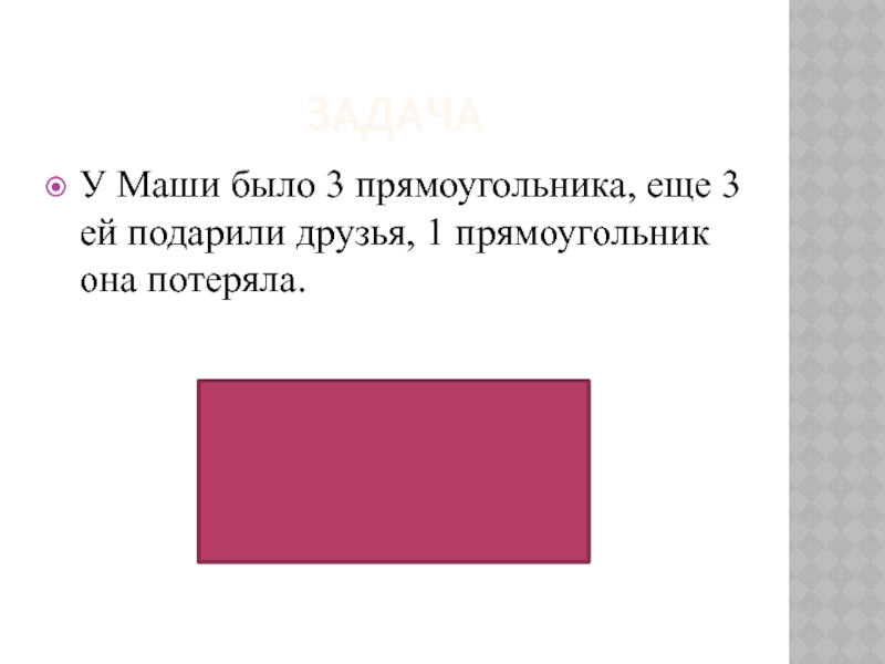 ЗадачаУ Маши было 3 прямоугольника, еще 3 ей подарили друзья, 1 прямоугольник она потеряла.