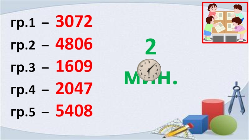 гр.1 – 3072гр.2 – 4806 гр.3 – 1609 гр.4 – 2047 гр.5 – 5408 2 мин.
