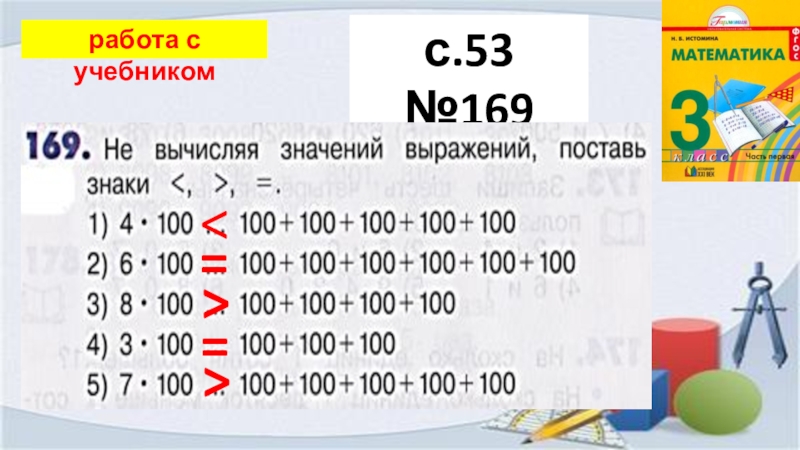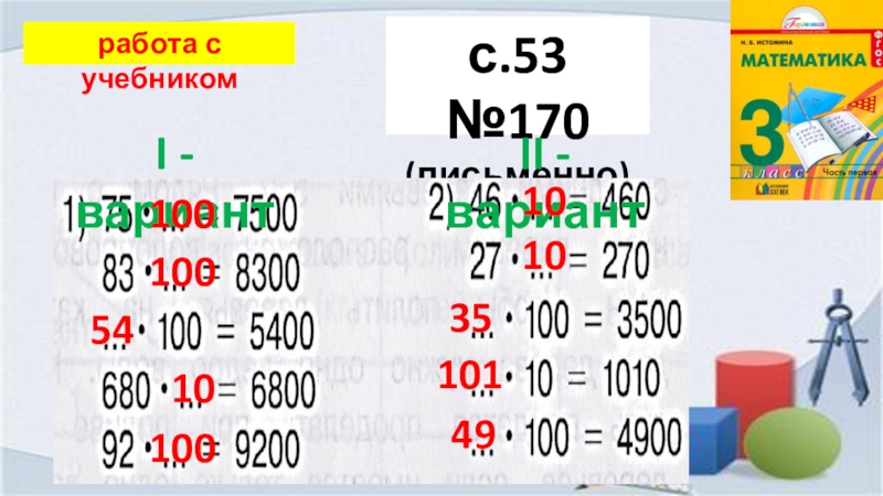 с.53 №170(письменно)работа с учебникомI - вариантII - вариант100100100541010103510149