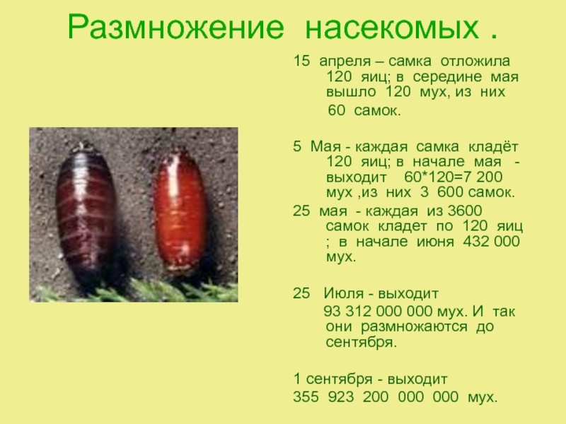 25 мая - каждая из 3600 самок кладет по 120 яиц ; в начале июня 432 000 мух.