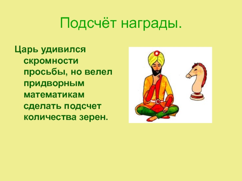 Царь удивился скромности просьбы, но велел придворным математикам сделать подсчет