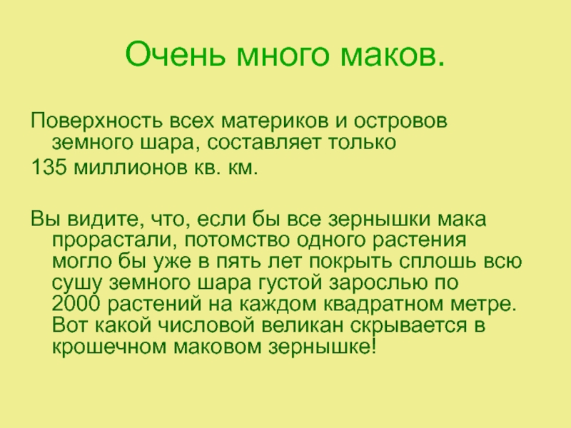 Вы видите, что, если бы все зернышки мака прорастали, потомство одного растения могло бы уже в пять лет покрыть сплошь всю сушу земного шара густой зарослью по
