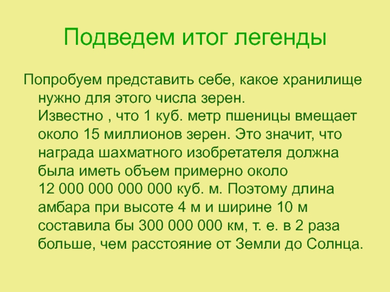 Известно , что 1 куб. метр пшеницы вмещает около 15 миллионов зерен. Это значит, что награда шахматного изобретателя должна была иметь объем примерно около