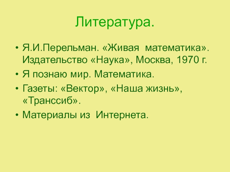 Я.И.Перельман. «Живая математика». Издательство «Наука», Москва, 1970 г.