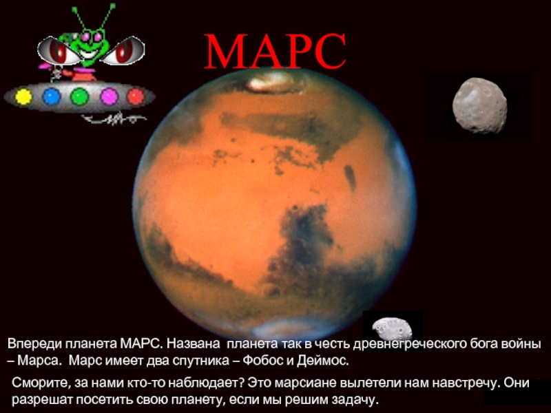 Сморите, за нами кто-то наблюдает? Это марсиане вылетели нам навстречу. Они разрешат посетить свою планету, если мы решим задачу.