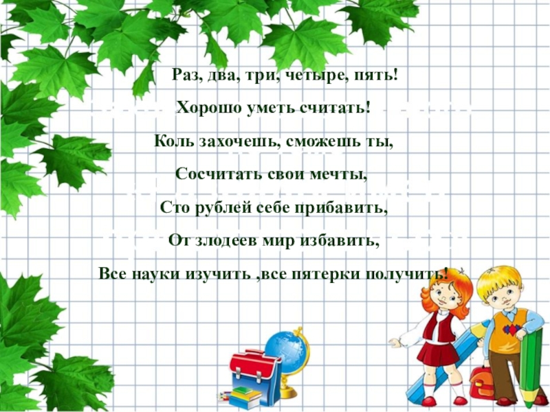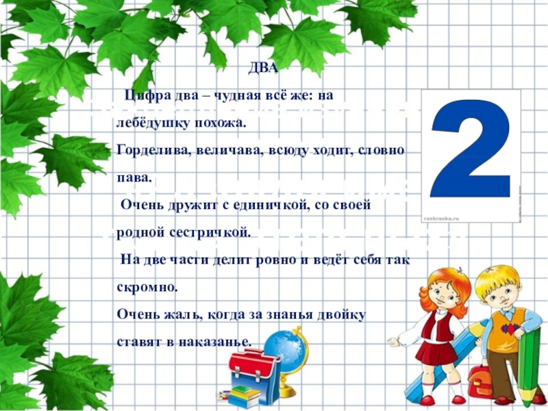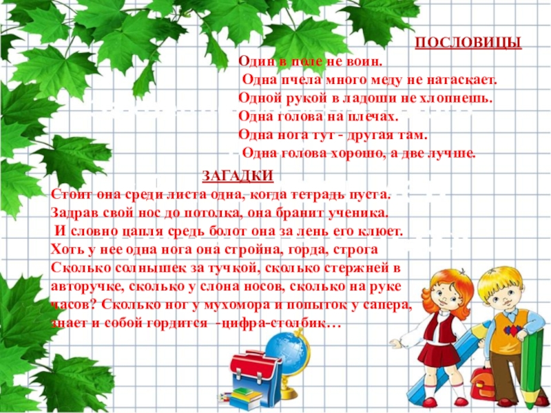И словно цапля средь болот она за лень его клюет. Хоть у нее одна нога она стройна, горда, строга Сколько солнышек за тучкой, сколько стержней в авторучке, сколько у слона носов, сколько на руке часов? Сколько ног у мухомора и попыток у сапера, знает и собой гордится -цифра-столбик…