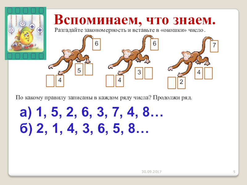 а) 1, 5, 2, 6, 3, 7, 4, 8…