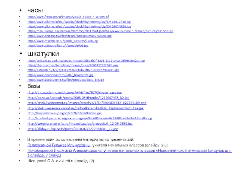 часыhttp://www.freeware.ru/Images/26614_sclock-7_screen.gifhttp://www.alltime.ru/obj/catalog/clock/rhythm/img/big/CMG881CR18.jpghttp://www.alltime.ru/obj/catalog/clock/rhythm/img/big/CMG407NR19.jpghttp://m.io.ua/img_aa/medium/0921/55/09215574.jpghttp://www.svstime.ru/admin/pictures/99153b.jpghttp://www.eratime.ru/files/image/catalogue/889748594.jpghttp://www.rhythm-co.ru/goods_pictures/1786.jpghttp://www.admos-gifts.ru/i/goods/g/03.jpgшкатулкиhttp://content.podarki.ru/goods-images/9d3d3b7f-3205-4171-a40a-08fe505c92ac.jpghttp://chart.com.ua/templates/images/price/9095427527363.jpeghttp://1.imgbb.ru/4/2/a/42a72aa606f8b28f026106e7bb9696e5.jpghttp://www.beadcave.com/julia/_boxes/07e.jpghttp://www.1001suvenir.ru/files/products/6899_big.jpgВазыhttp://dic.academic.ru/pictures/wiki/files/67/Chinese_vase.jpghttp://open.az/uploads/posts/2008-08/thumbs/1219667438_k2.jpghttp://img0.liveinternet.ru/images/attach/c/1/64/3/64003332_022724189.pnghttp://steklokeramika.narod.ru/belhudkeramika/foto_big/vazochka1312a.jpghttp://bigpodarok.ru/imgbd/2009/02/14/b4936.jpghttp://content.podarki.ru/goods-images/e0ab886f-eaeb-4823-803a-b624e3db5a8b.jpghttp://www.orange-gifts.ru/image/catalog/products/l_12-09-0350.jpghttp://allday.ru/uploads/posts/2010-07/1277984601_22.jpgВ презентации использованы материалы из презентаций:Галихузиной Гульназ Ильнуровны, учителя начальных классов (слайды 2-5)Пономаревой Людмилы Александровны учителя начальных классов «Новоаннинской