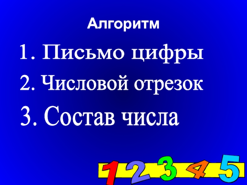 Алгоритм1. Письмо цифры2. Числовой отрезок3. Состав числа