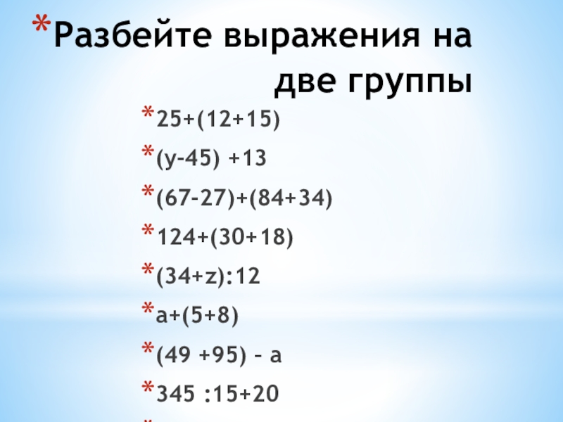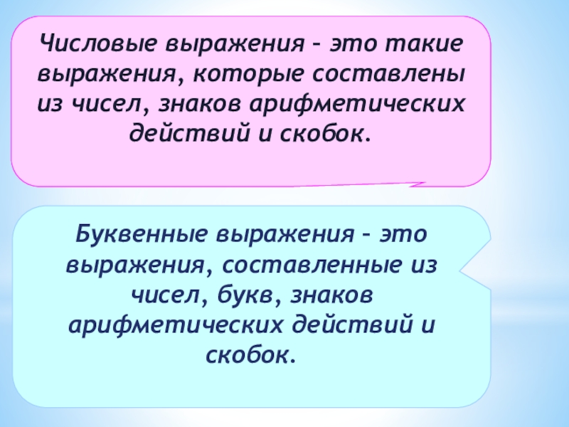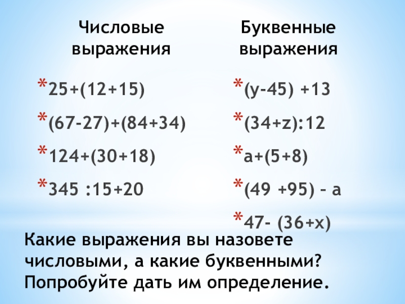 Какие выражения вы назовете числовыми, а какие буквенными? Попробуйте дать им определение.