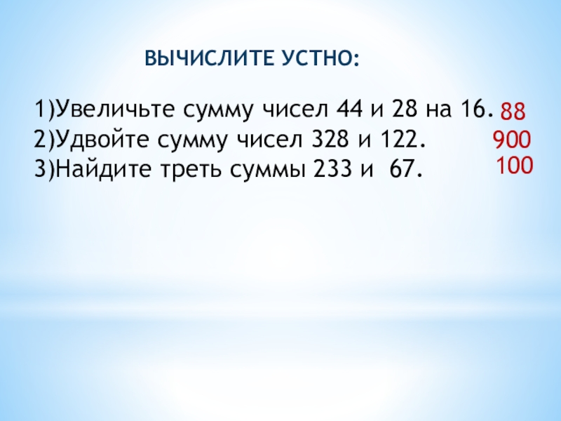 1)Увеличьте сумму чисел 44 и 28 на 16.