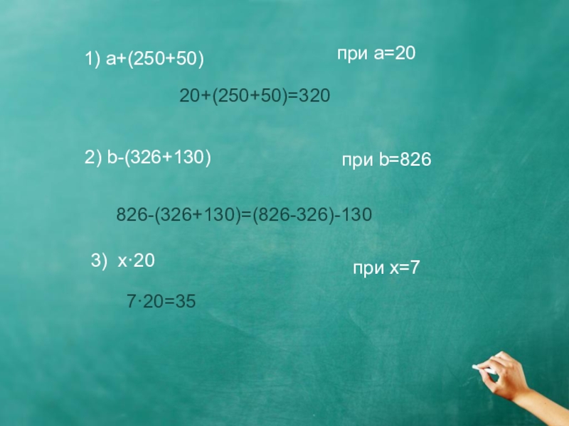 1) а+(250+50)при а=2020+(250+50)=3202) b-(326+130)при b=8263) x·20при x=7826-(326+130)=(826-326)-1307·20=35
