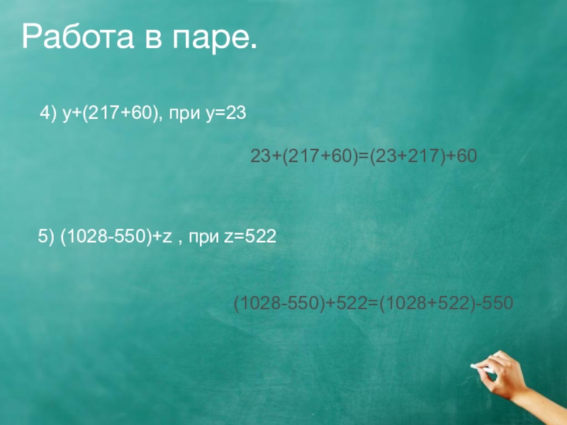 Работа в паре.4) у+(217+60), при у=2323+(217+60)=(23+217)+605) (1028-550)+z , при z=522(1028-550)+522=(1028+522)-550