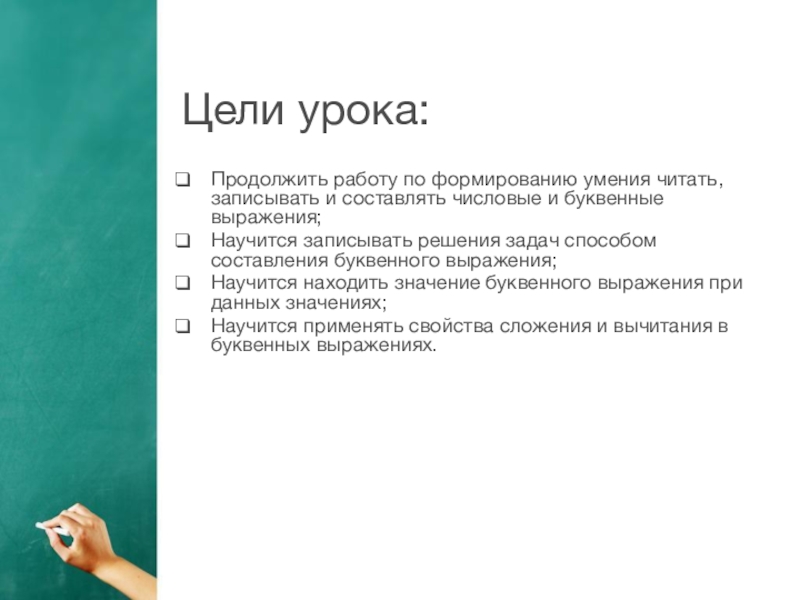 Цели урока:Продолжить работу по формированию умения читать, записывать и составлять числовые и буквенные выражения;Научится записывать решения задач способом составления буквенного выражения;Научится находить значение буквенного выражения при данных значениях;Научится применять свойства сложения и вычитания в буквенных выражениях.