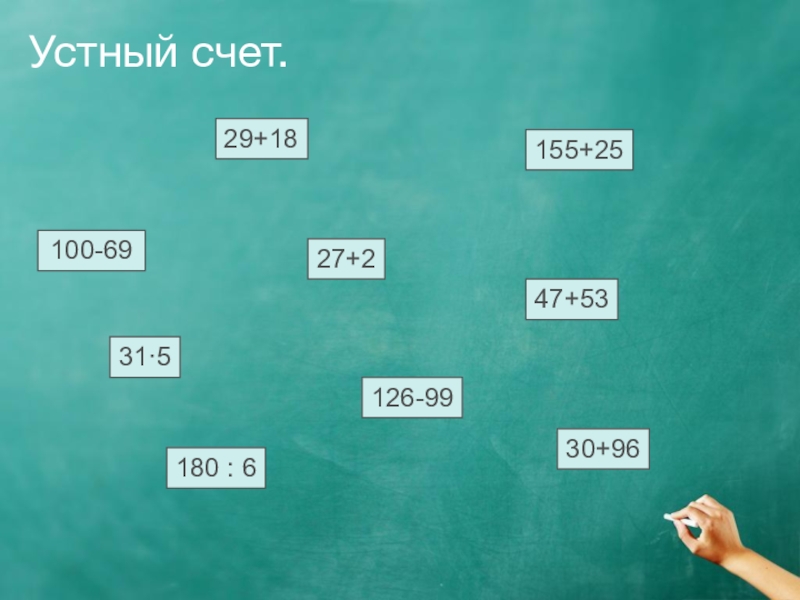 Устный счет.100-6929+1827+247+53155+2531·5126-9930+96180 : 6