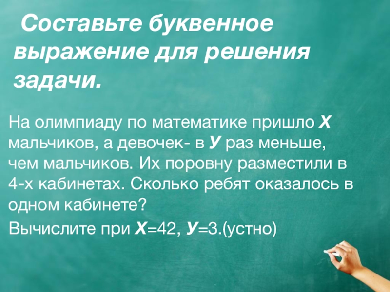 Составьте буквенное выражение для решения задачи.  На олимпиаду по математике пришло X мальчиков, а девочек-
