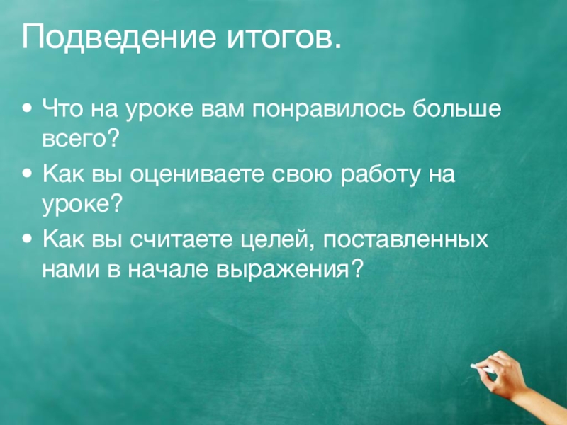 Подведение итогов.Что на уроке вам понравилось больше всего?Как вы оцениваете свою работу на уроке?Как вы считаете целей,
