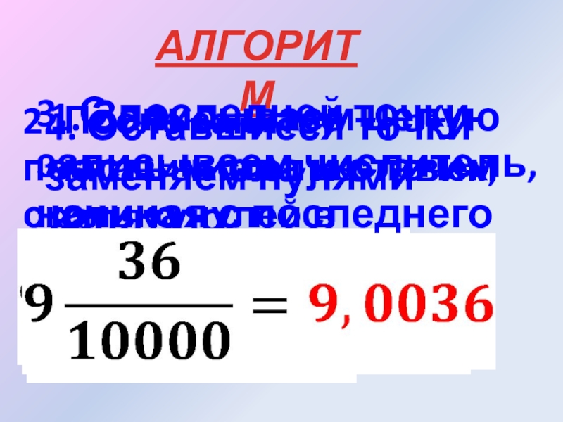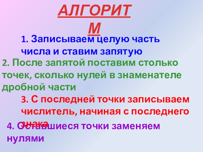 2. После запятой поставим столько точек, сколько нулей в знаменателе дробной части