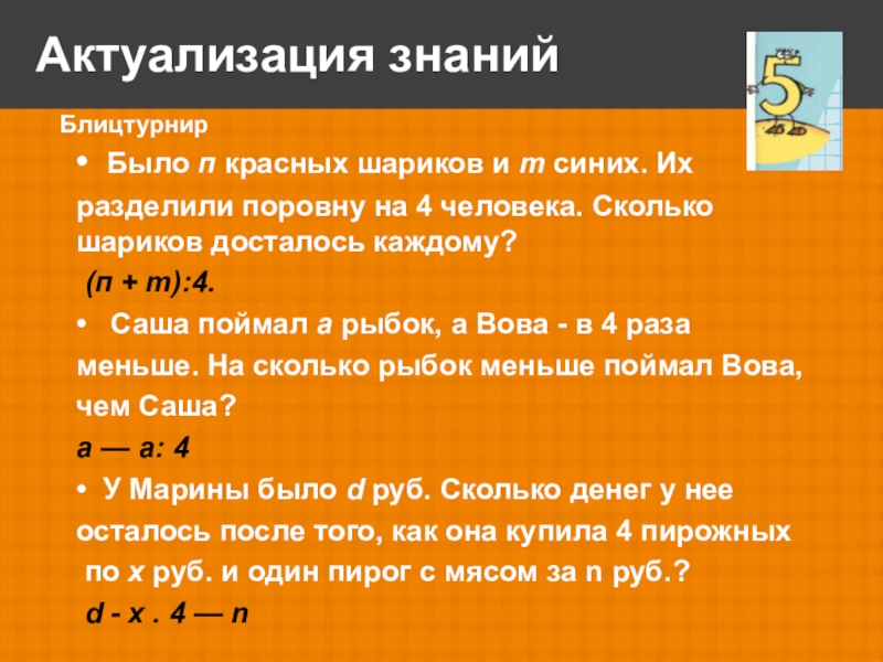 Актуализация знаний Блицтурнир• Было п красных шариков и т синих. Их разделили поровну на 4 человека. Сколько шариков досталось каждому? (п + т):4.• Саша поймал а рыбок, а Вова - в 4 раза меньше.