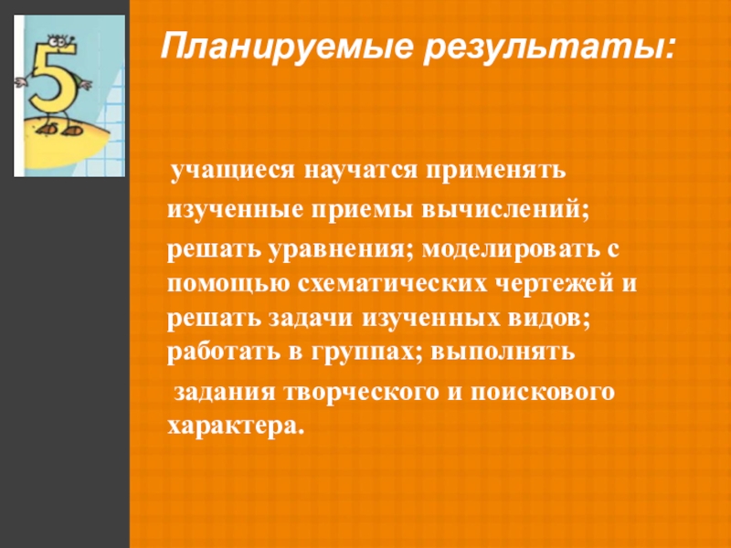 Планируемые результаты:  учащиеся научатся применять изученные приемы вычислений; решать уравнения; моделировать с помощью схематических чертежей