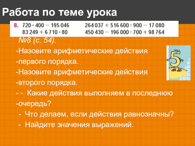 Работа по теме урокаРабота по учебнику№8 (с. 54).Назовите арифметические действия первого порядка. Назовите арифметические действия второго порядка.