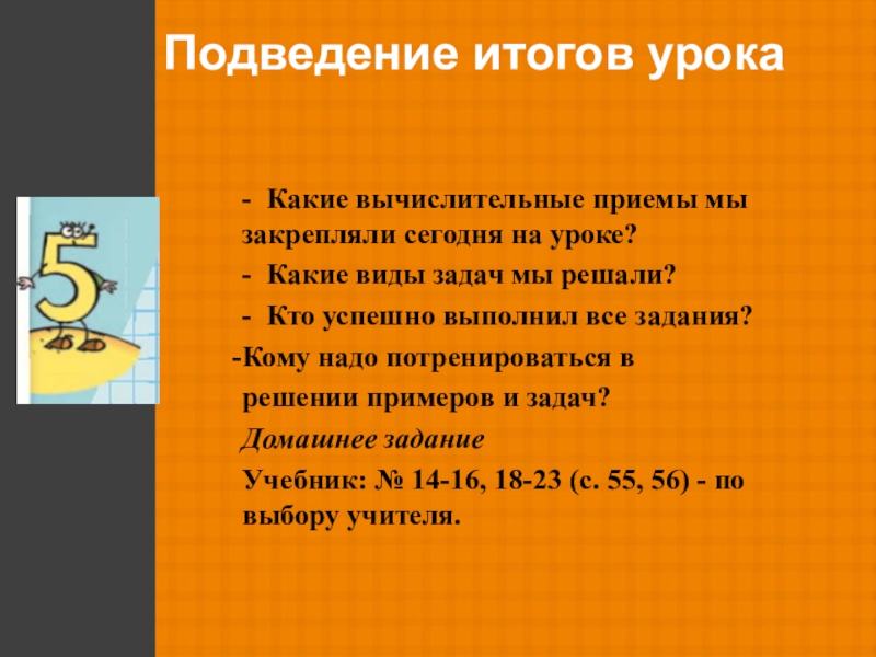 Подведение итогов урока- Какие вычислительные приемы мы закрепляли сегодня на уроке?- Какие виды задач мы решали?- Кто