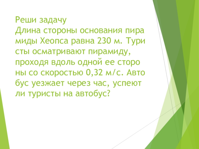 Слайд 8Реши задачу Длина сто­ро­ны ос­но­ва­ния пи­ра­ми­ды Хео­пса равна 230 м. Ту­ри­сты осмат­ри­ва­ют