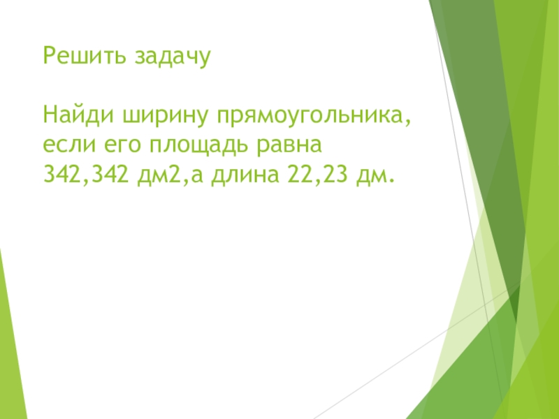Слайд 7Решить задачу Найди ширину прямоугольника, если его площадь равна 342,342 дм2,а длина 22,23