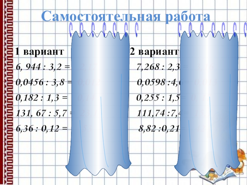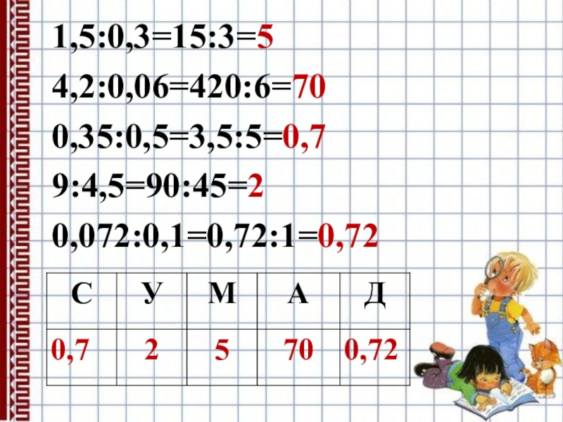 1)в ………….. и в делителе перенести запятую ……….на столько цифр, сколько их после ……….. в …………. ;