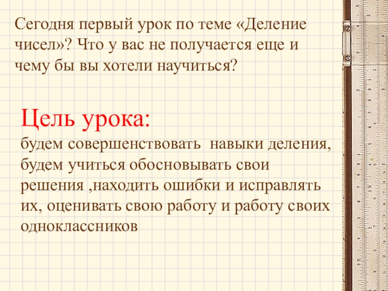 будем совершенствовать навыки деления, будем учиться обосновывать свои решения ,находить ошибки и исправлять их, оценивать свою работу и работу своих одноклассников