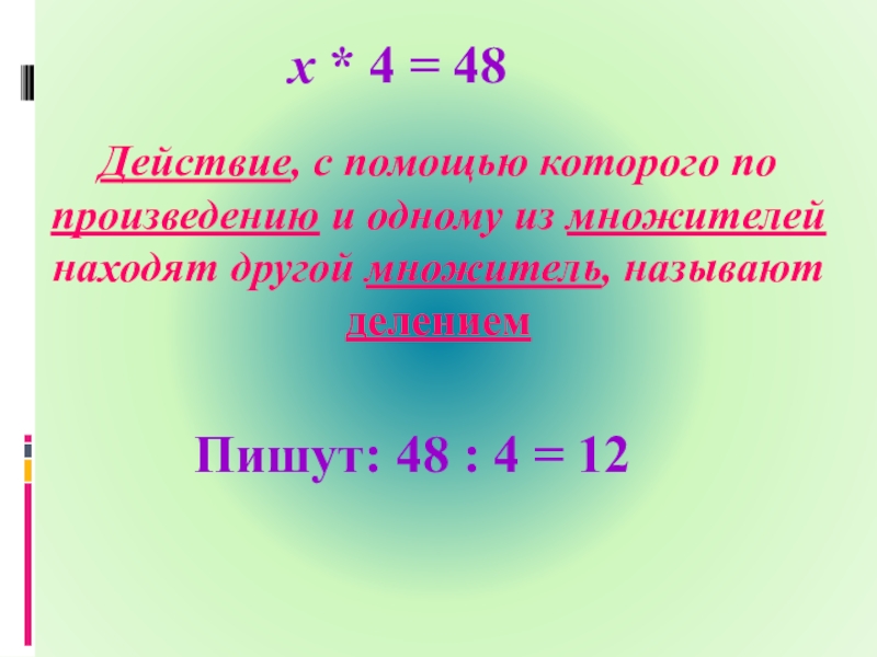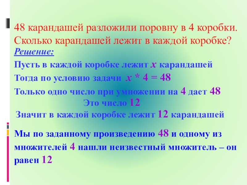 Мы по заданному произведению 48 и одному из множителей 4 нашли неизвестный множитель – он равен 12