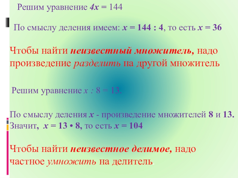 По смыслу деления имеем: х = 144 : 4, то есть х = 36